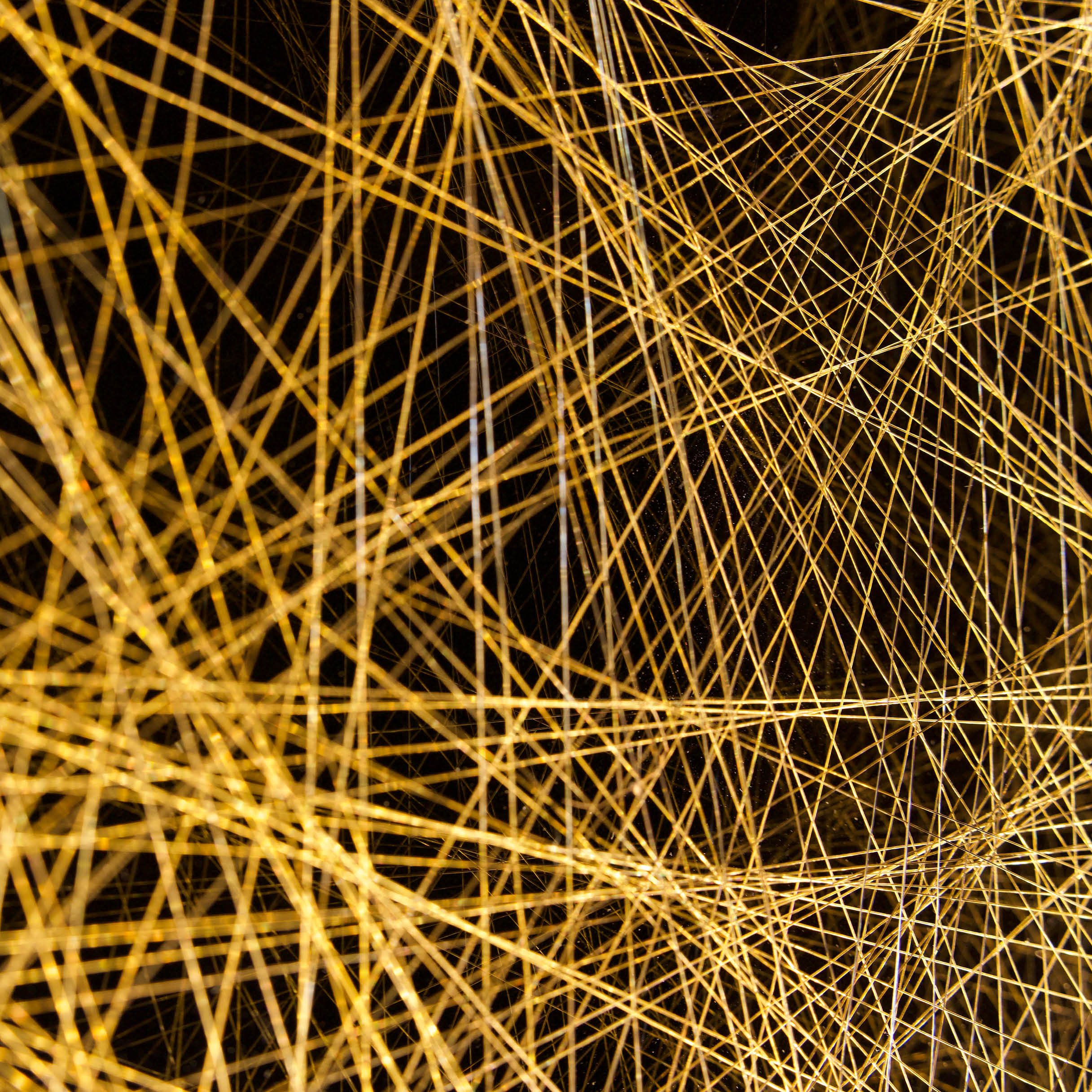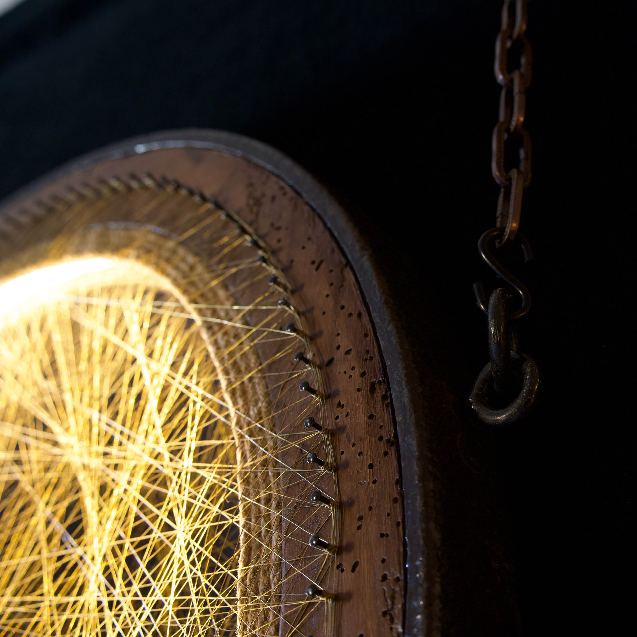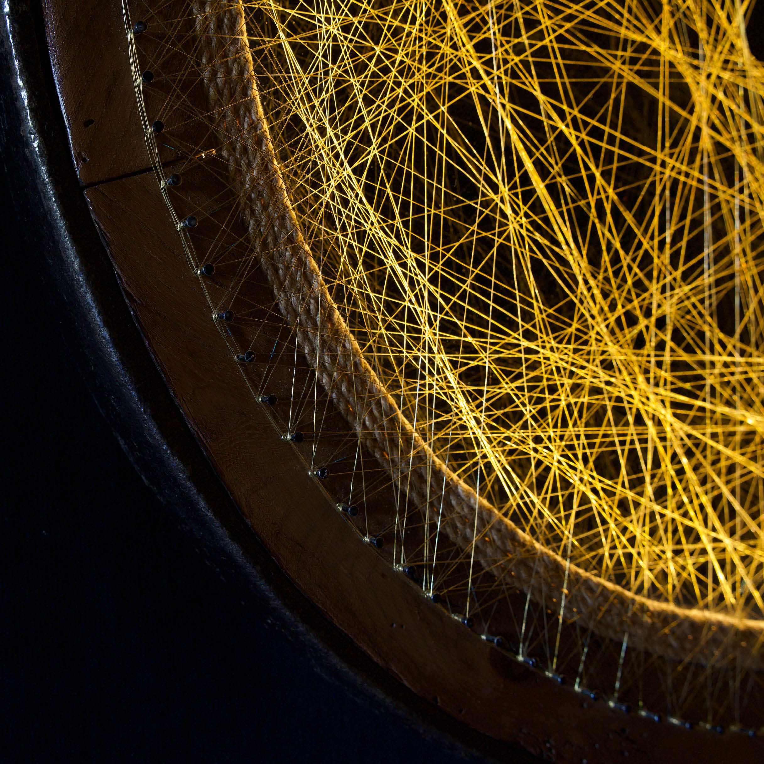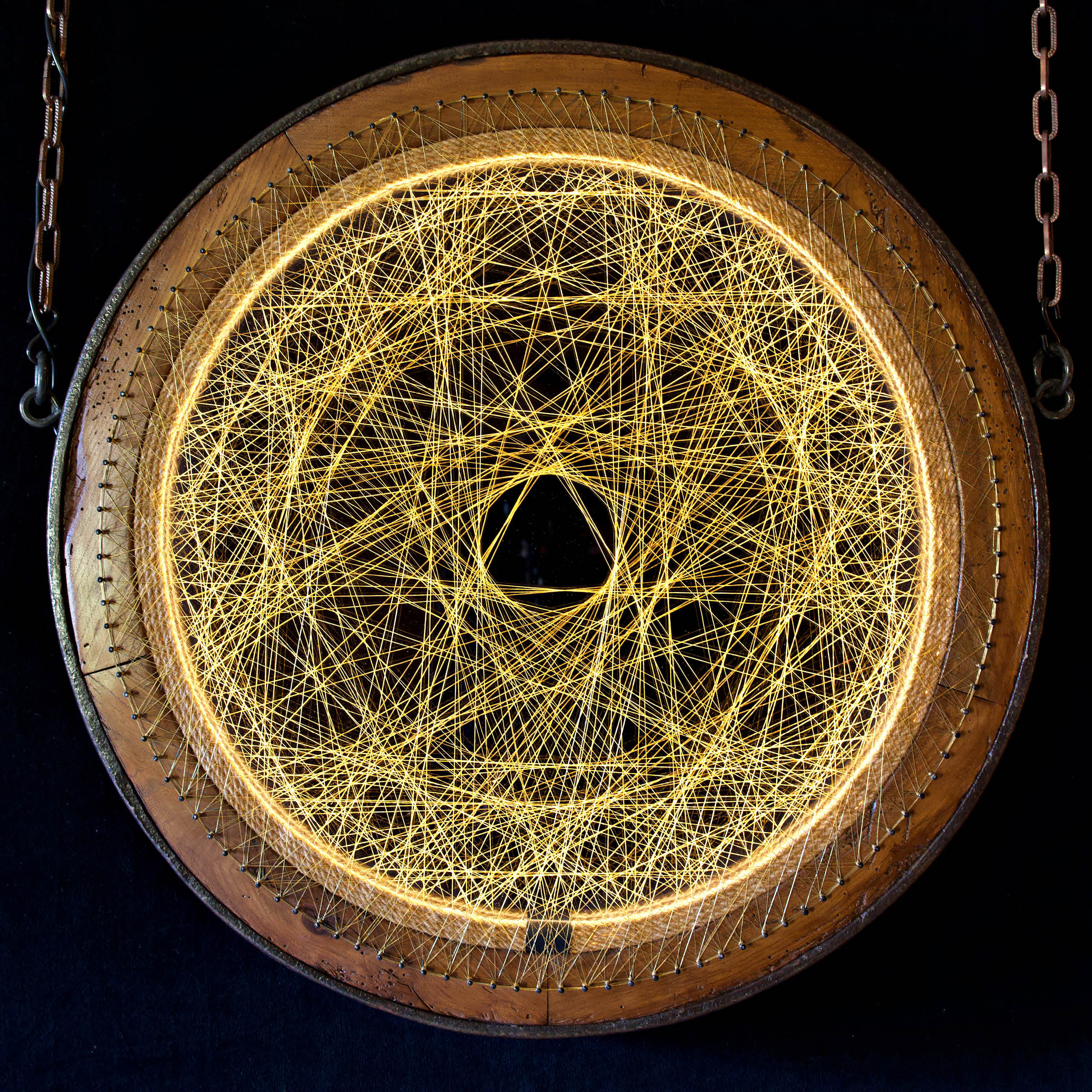 « Horus » est un tambour Rustica réalisé à partir d’une ancienne roue de char de 69 cm de diamètre. Oeuvre d’art signée tissée du Mutagramme n°31 répliqué 3 fois. 360 fils de laiton. Tambour charismatique par la tonalité solaire de sa lumière et la géométrie de son tissage.