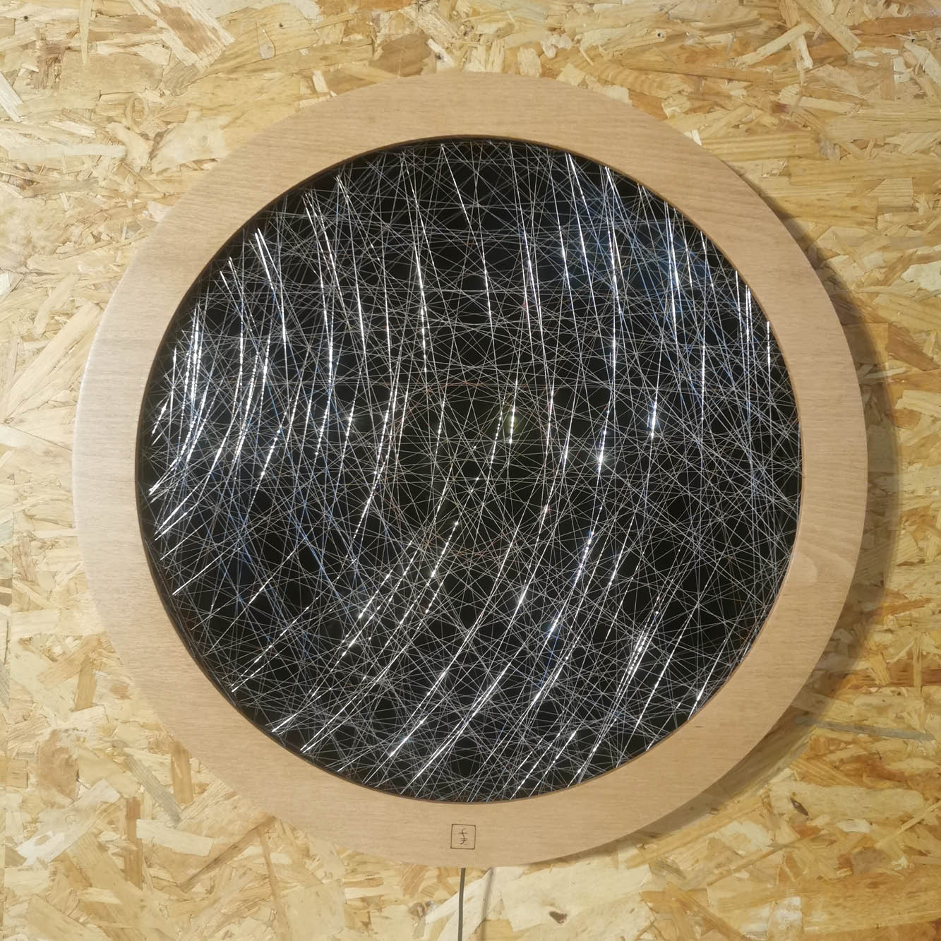 « Sacré coeur » est un tambour Radian de 60 cm de diamètre réalisé à partir d’un panneau 3 plis en hêtre. Oeuvre d’art signée tissée du Mutagramme n°77 répliqué 3 fois. 360 fils (dont 10% de laiton, 30% de cuivre et 60% de métal blanc). Tambour à la douceur lunaire, son tissage « rond » et organique renvoie une lumière scintillante et raffinée.