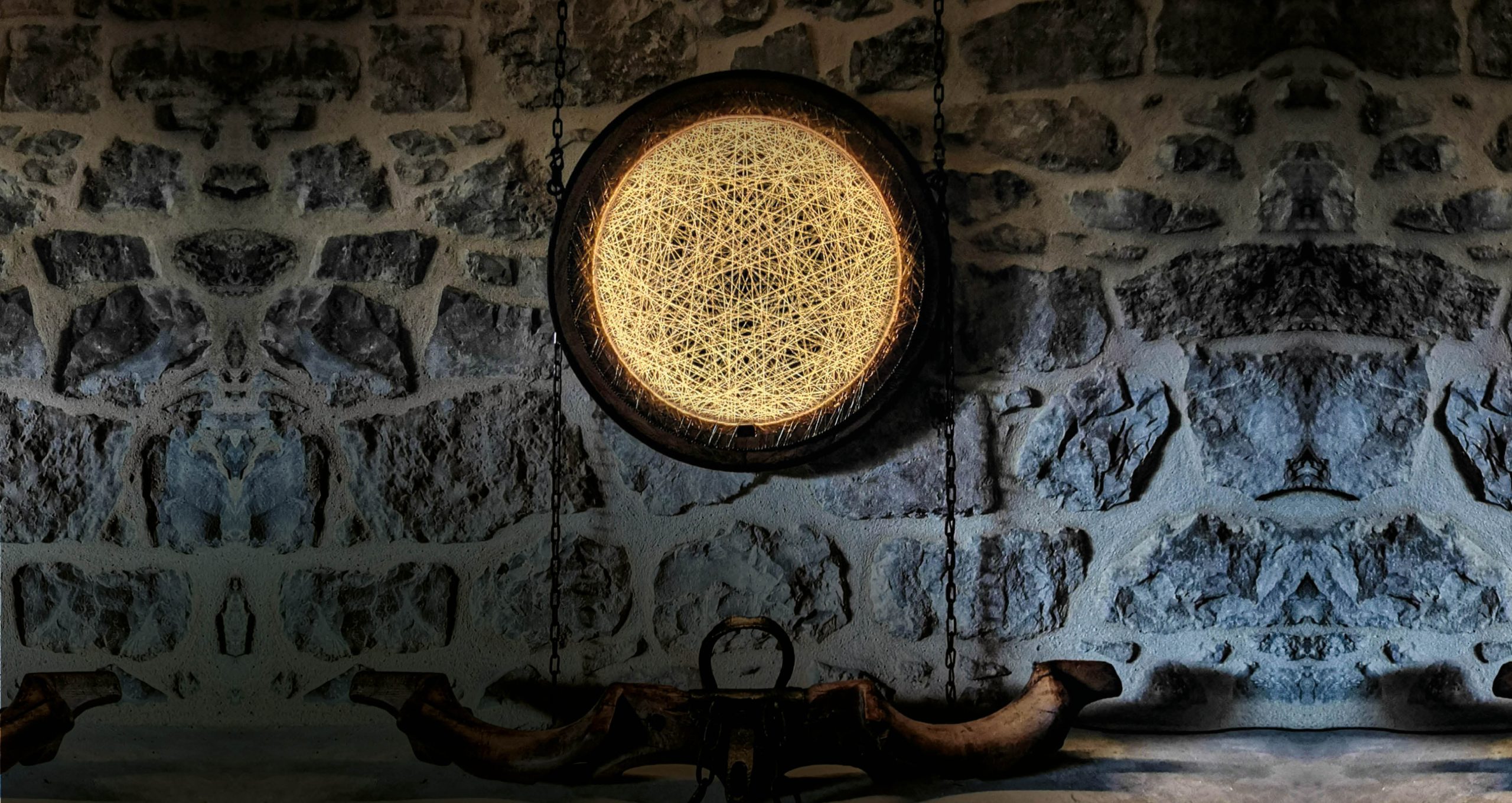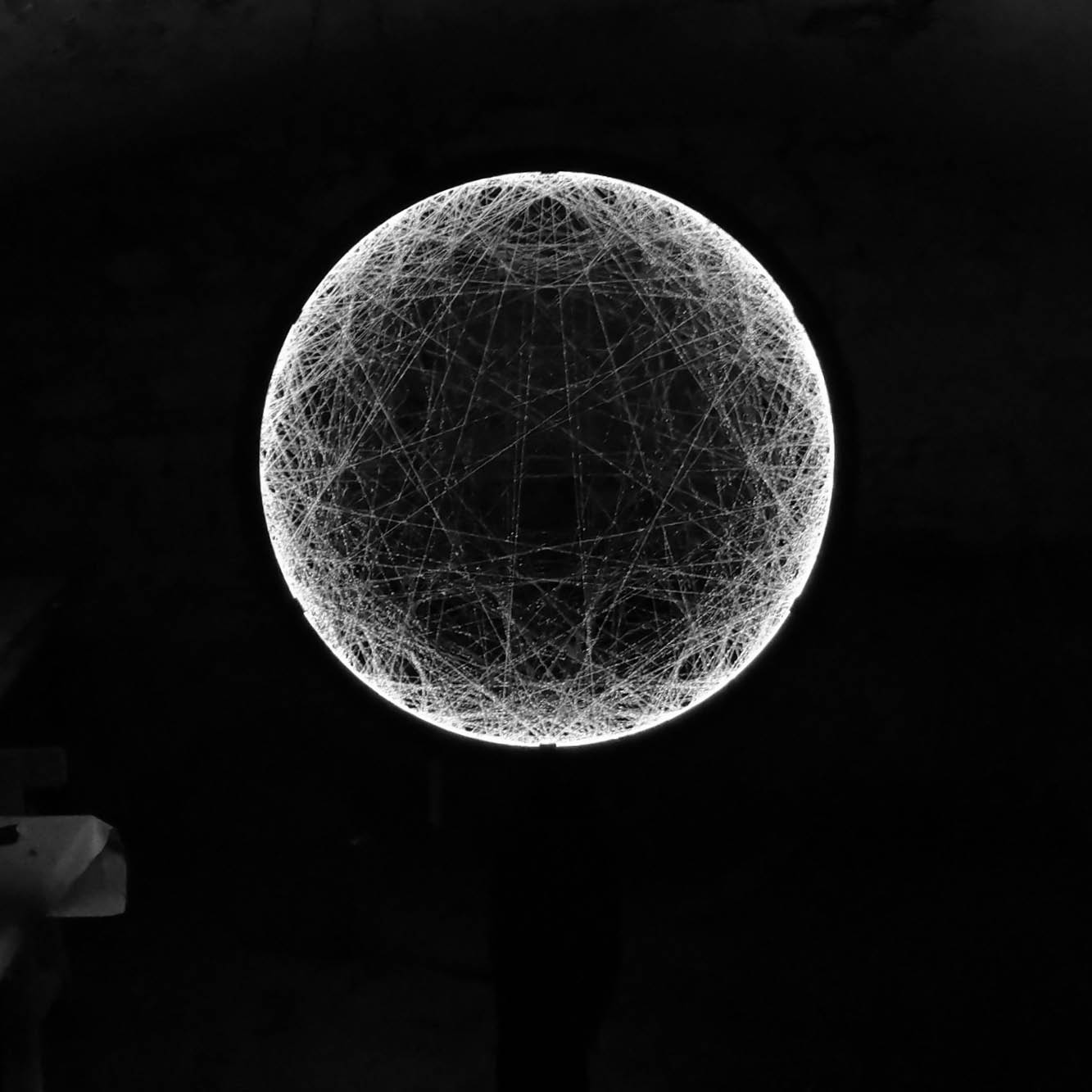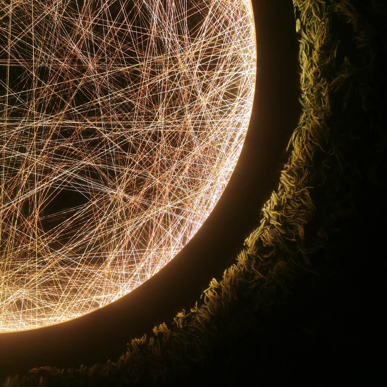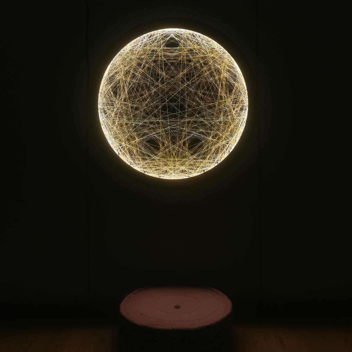 Les Tambours reposent sur le principe d’une lumière rasante dont la source est un ruban LED dissimulé en périphérie. La lumière est plus intense vers les bords et diminue vers le centre. Cet « ombrage » créer l’illusion d’une sphère lumineuse sur les Tambours de grand diamètre. La force de mes création réside aussi dans le miroir sombre disposé à l’arrière. Grâce à lui, la lumière ne se diffuse pas sur l’arrière plan qui reste noir et profond pour permettre aux fils éclairés de ressortir pleinement.
