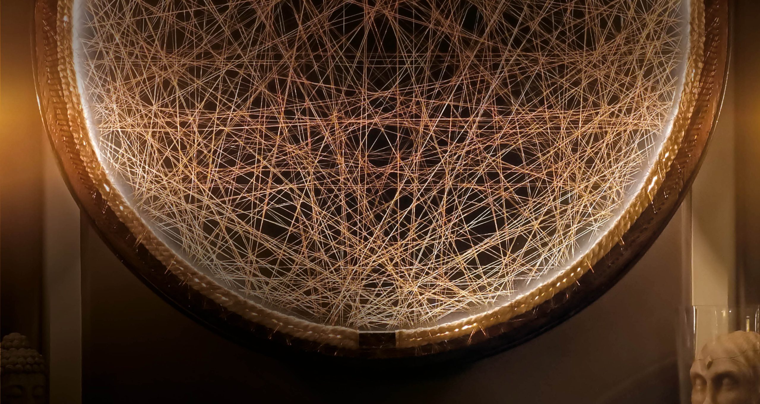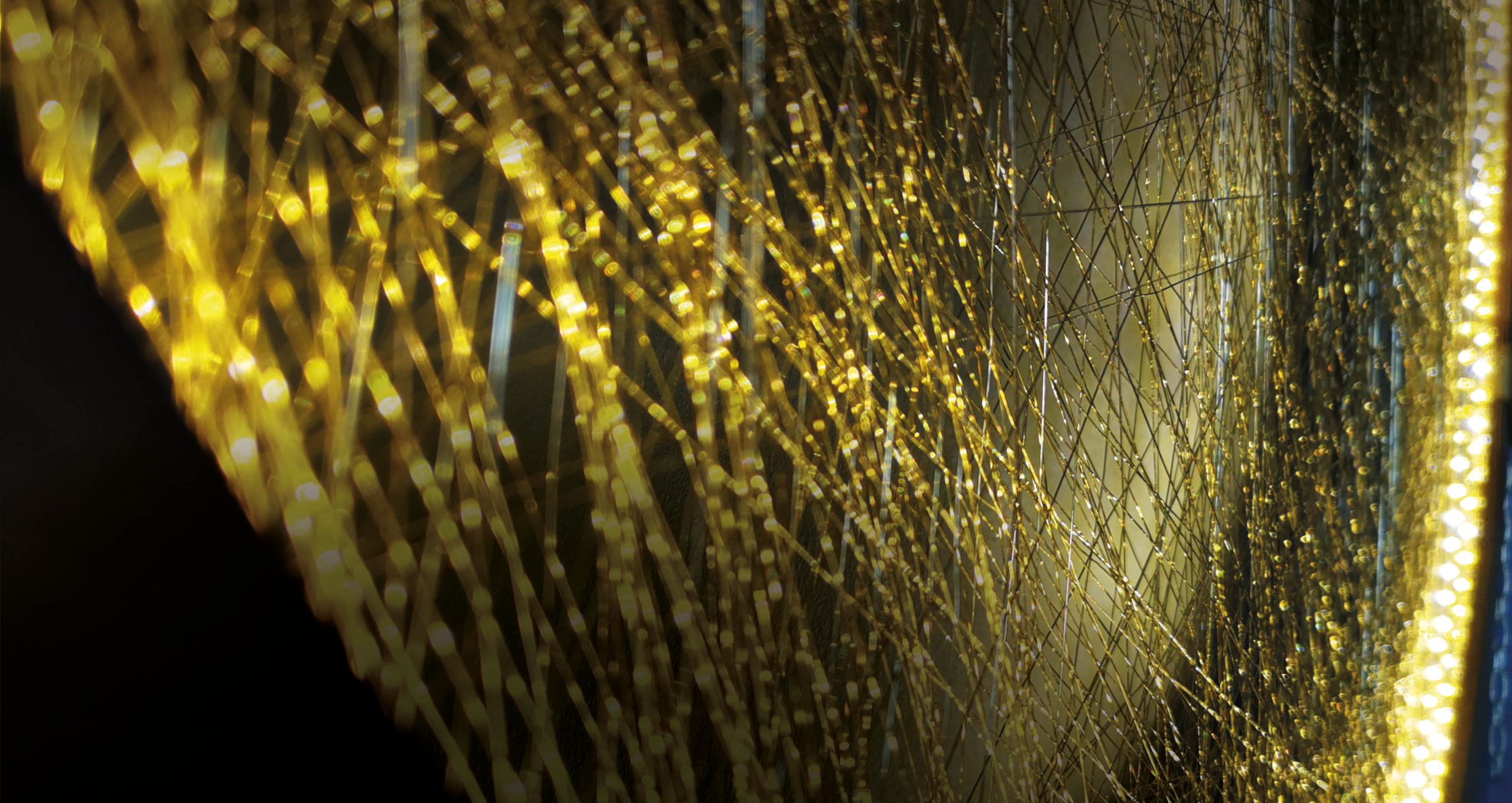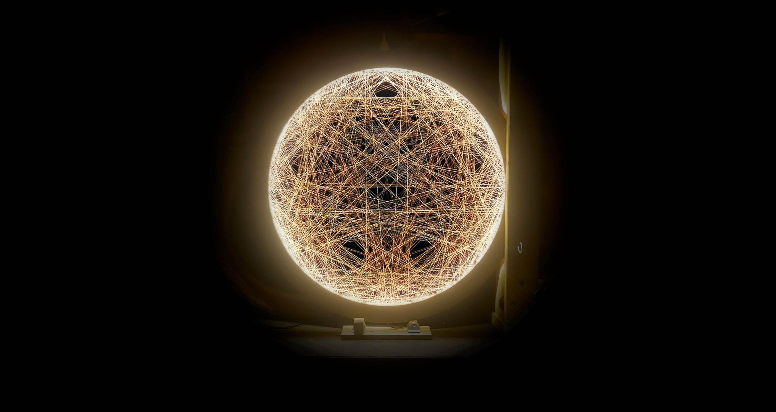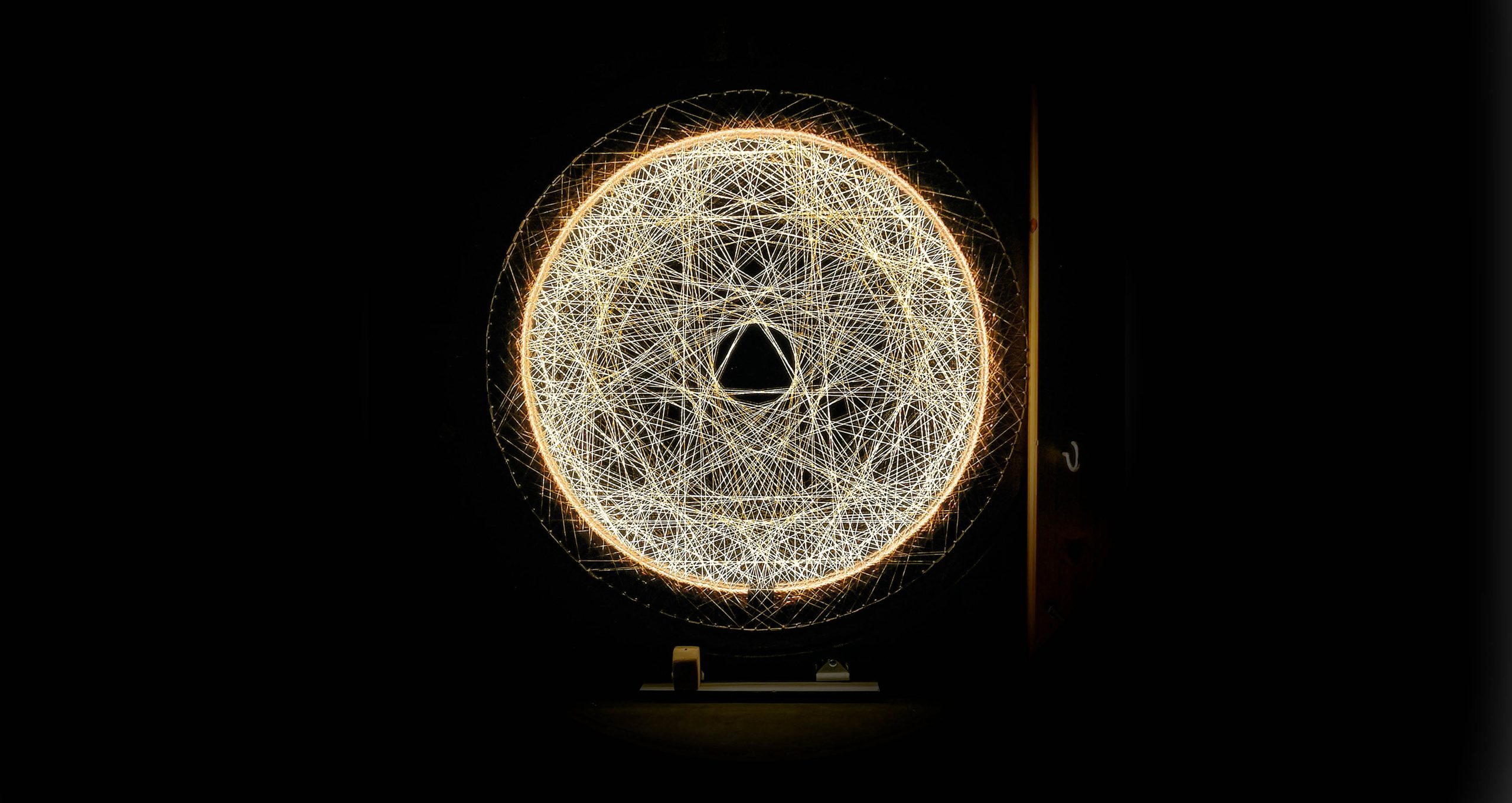 Les Tambours reposent sur le principe d’une lumière rasante dont la source est un ruban LED dissimulé en périphérie. La lumière est plus intense vers les bords et diminue vers le centre. Cet « ombrage » créer l’illusion d’une sphère lumineuse sur les Tambours de grand diamètre. La force de mes création réside aussi dans le miroir sombre disposé à l’arrière. Grâce à lui, la lumière ne se diffuse pas sur l’arrière plan qui reste noir et profond pour permettre aux fils éclairés de ressortir pleinement.