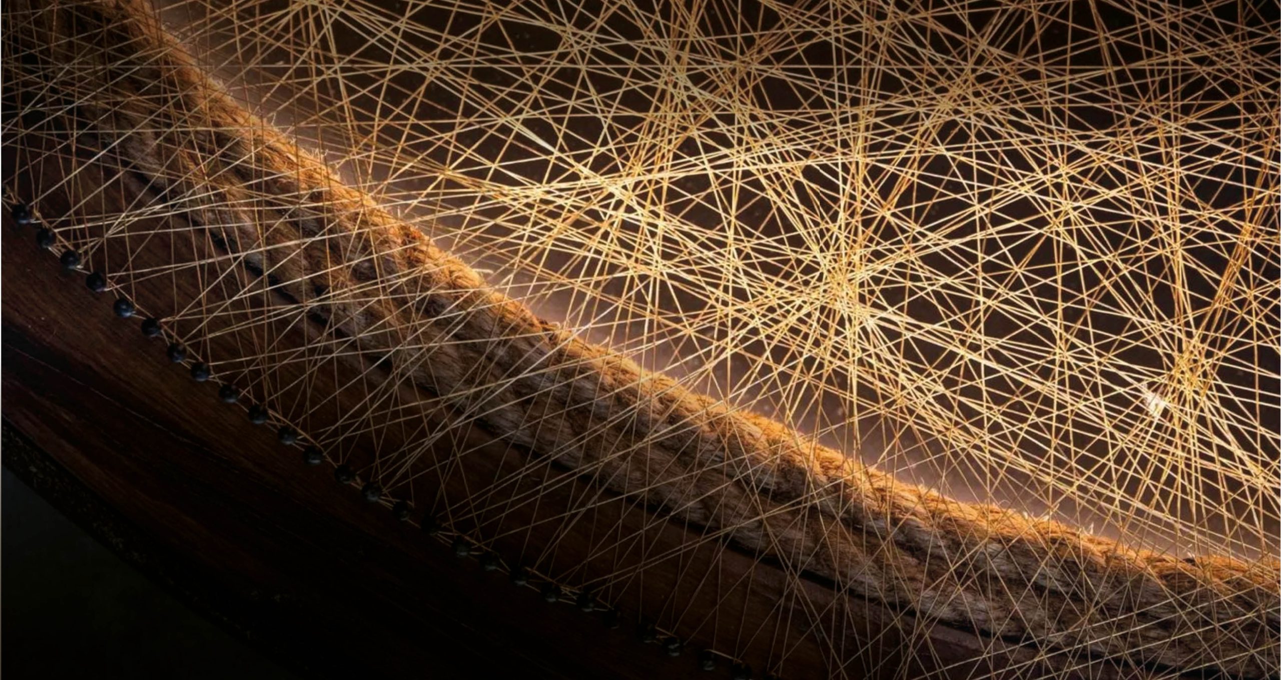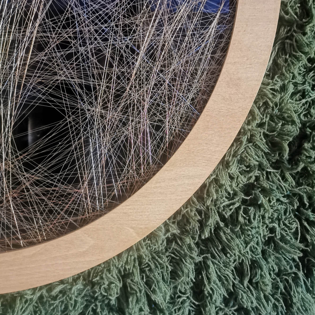 Réalisé à la main, le tissage est la dernière étape de la fabrication, celle qui donne véritablement naissance au Tambour. Lorsque le cadre est terminé, il est installé sur une table de tissage et les points d’ancrages sont numérotés. Le tissage peut alors commencer. Le fil est fixé sur un clou puis tendu d’un point à l’autre du cercle, fixé à nouveau, et ainsi de suite pour obtenir la figure voulue. Le nombre de fils varie entre 200 et 800, voire plus de 1000 sur certaines réalisations. Le tissage nécessite alors de plusieurs heures à plusieurs jours de travail.
