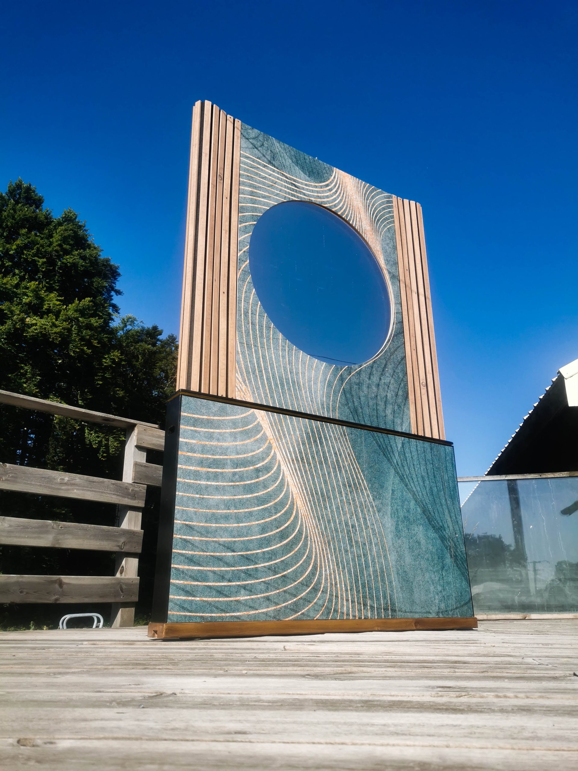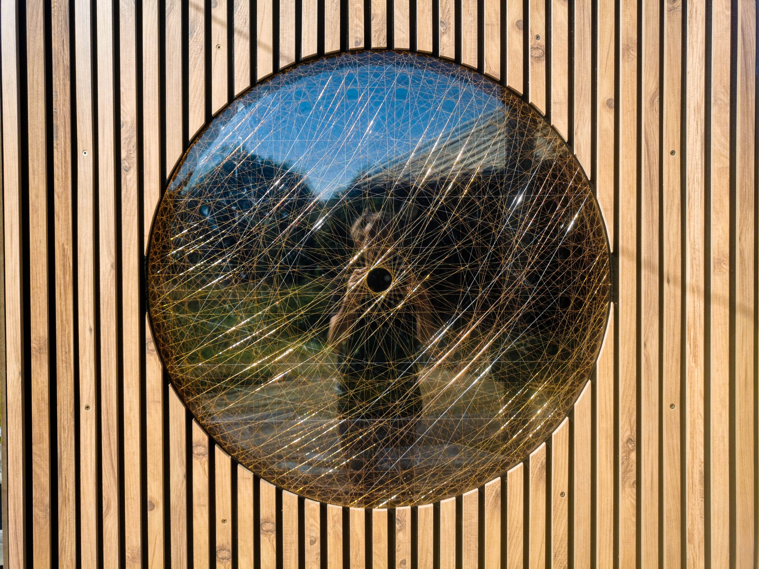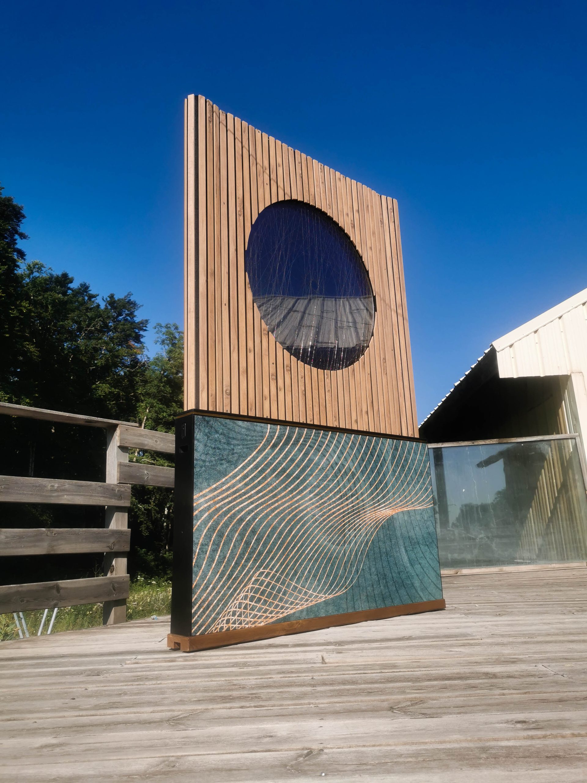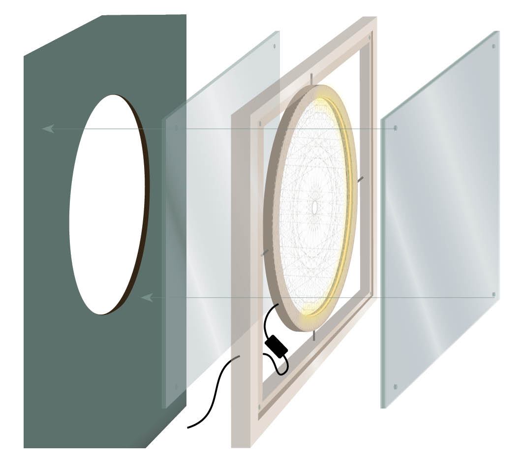 Ce Tambour est destiné à être encastré dans une cloison, sur un mode « aveugle » ou traversant, à la façon d’un hublot entre 2 pièces. Sa ou ses faces peuvent être librement habillées par un miroir sans tain et/ou un simple vitrage. Lorsque le Tambour s’éclaire le miroir perd son caractère réfléchissant et laisse passer la lumière du Tambour. Si le dispositif est traversant, on pourra – selon l’éclairage ambiant – voir à travers la cloison ainsi que le tissage de fils métalliques.
