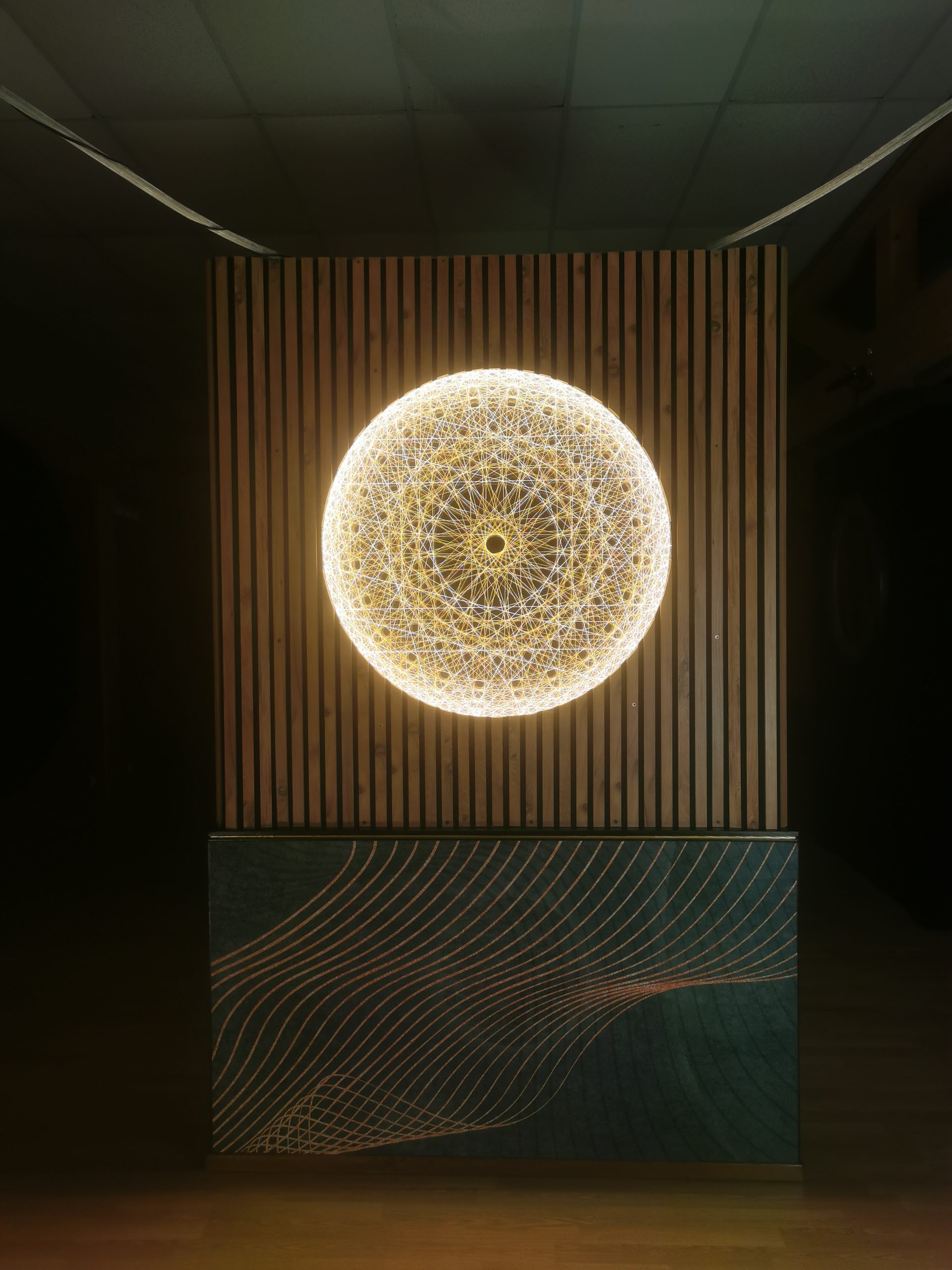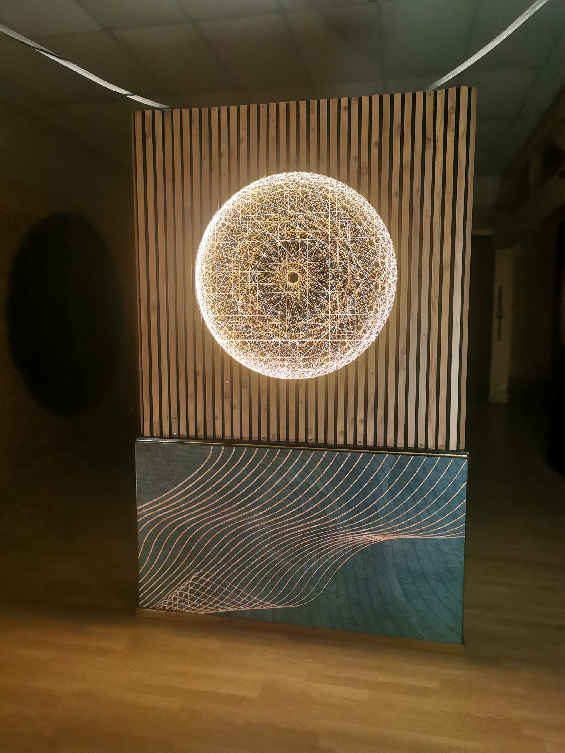 Le projet se définit au cas par cas, avec un maître d’œuvre le cas échéant. Je réalise le cerceau structurel du Tambour, son tissage ainsi que le dispositif électrique et lumineux. Suivant les contraintes, je réalise un cadre supplémentaire destiné à supporter également la/les parois vitrées. Le tout est réalisé de façon à pouvoir être posé et fixé dans une cloison.